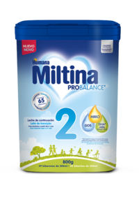 Nuestra leche de continuación Miltina PROBALANCE® 2 está especialmente indicada para la fase de introducción de alimentos sólidos, ya sea como complemento a la leche materna o para la toma en exclusiva de biberón para apoyar el crecimiento y desarrollo de tu bebé.